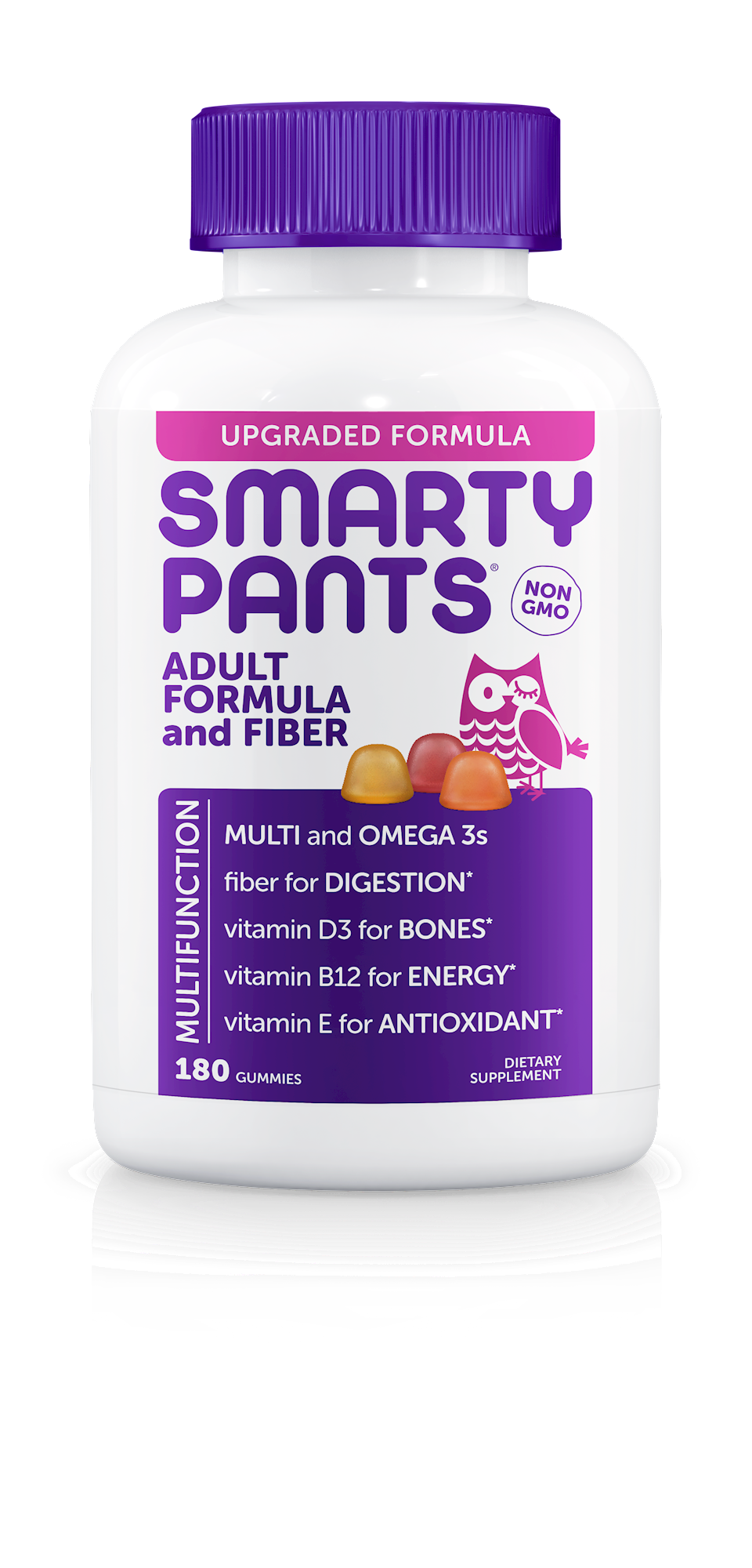 Serving Size: 6 Piece Servings Per Container: 30 Disclaimer Amount Per Serving Calories 20 Total Fat, less than 1 g Cholesterol, less than 5 mg Total Carbohydrate 10 g 4% Dietary Fiber 6 g 23% Soluble Fiber 6 g Sugars 3 g Includes 3 g Added Sugars 7% Vitamin A (as 50% beta-carotene, retinyl palmitate USP) 270 mcg 30% Vitamin C (as ascorbic acid USP) 67.5 mg 75% Vitamin D (D-3 as cholecalciferol USP) (1200 IU) 30 mcg 150% Vitamin E (as d-alpha-tocopherol from sunflower oil FCC) 9.9 mg 66% Vitamin K (K-1 as phylloquinone) 18 mcg 15% Thiamin (Vitamin B-1 as thiamine mononitrate USP) 0.15 mg 13% Riboflavin USP (Vitamin B-2) 0.24 mg 18% Vitamin B-6 (as pyridoxal 5-phosphate) 1.5 mg 88% Folate (as L-methylfolate, calcium salt) (225 mcg L-methylfolate) DFE 375 mcg 94% Vitamin B-12 (as methylcobalamin) 2.7 mcg 113% Biotin USP 24 mcg 80% Pantothenic acid (as calcium D-pantothenate USP) 0.563 mg 11% Choline (as choline bitartrate) 18 mg 3% Iodine (as potassium iodide USP) 135 mcg 90% Zinc (as zinc citrate USP) 2.4 mg 22% Sodium 25 mg 1% Fish Oil 510 mg Total Omega-3 Fatty Acids (typical values) 150 mg EPA (Eicosapenteanoic Acid) 84 mg DHA (Docosahexaenoic Acid) 66 mg Choline (as choline citrate) 18 mg Inositol FCC 3 mg Vitamin K-2 (as menaquinone-7 FCC) 12 mcg Other ingredients: Inulin (Chicory Root Fiber), Gelatin, Pectin, Citric Acid, Natural Flavors, Colors Added (Organic Black Carrot Juice Concentrate,Organic Turmeric), Organic Sunflower Oil, Organic Carnauba Wax, Lo Han Fruit Concentrate