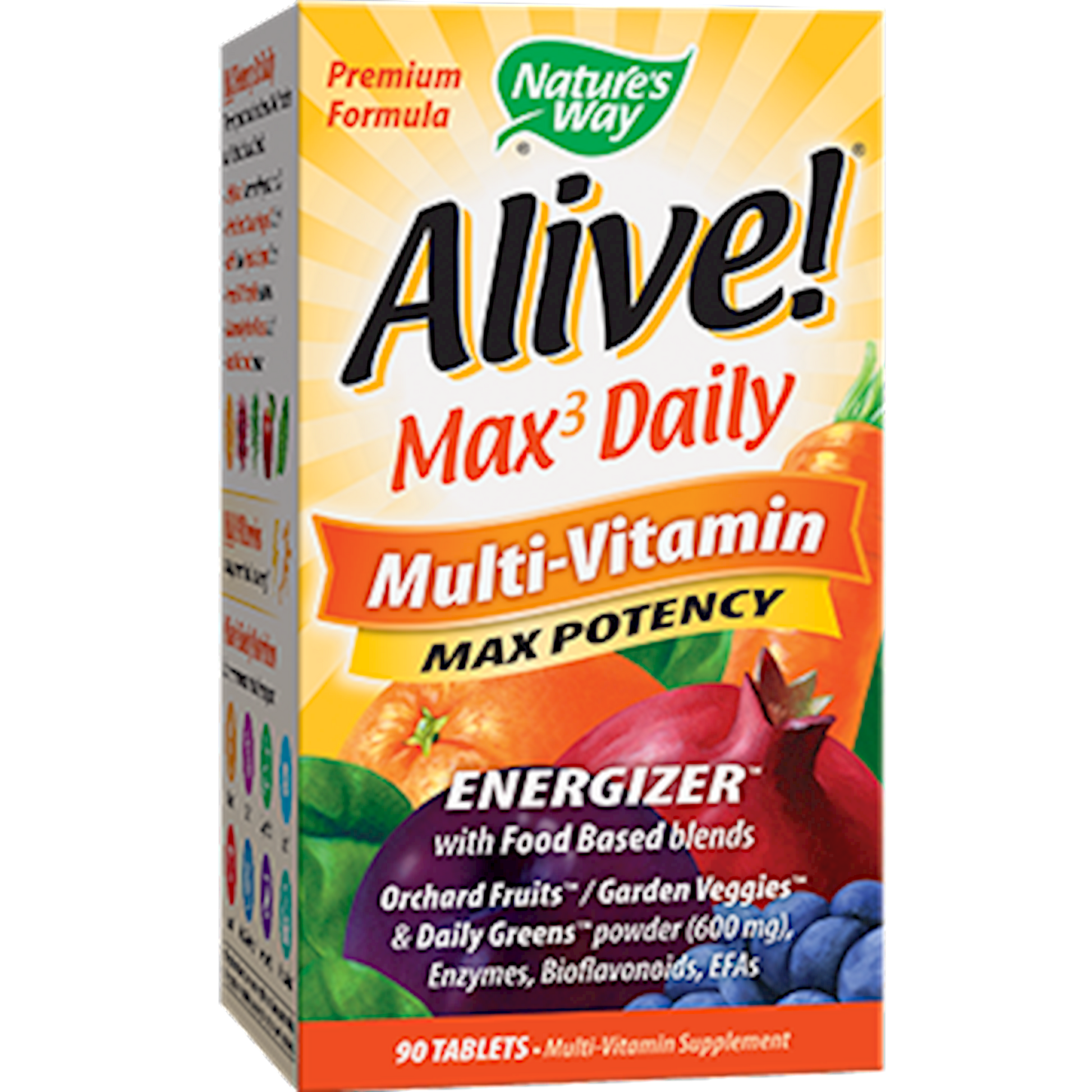 Our original MAX Potency Multi-vitamin Alive! MAX Potency contains a diversity of daily essentials, greens, phytonutrients and antioxidants. This multi-vitamin is made with essential nutrients, botanicals and system defenders including:* 23 vitamins and minerals 12 digestive enzymes 14 greens 12 organically grown mushrooms Antioxidants: Vitamin C, Vitamin E, beta carotene, selenium Its also packed with high potency B-vitamins to help convert food into energy*, Orchard Fruits/ Garden Veggies powder blend (200 mg per serving), and nutrients to help support bone health, daily energy, eye health, heart health, and immune health.*
