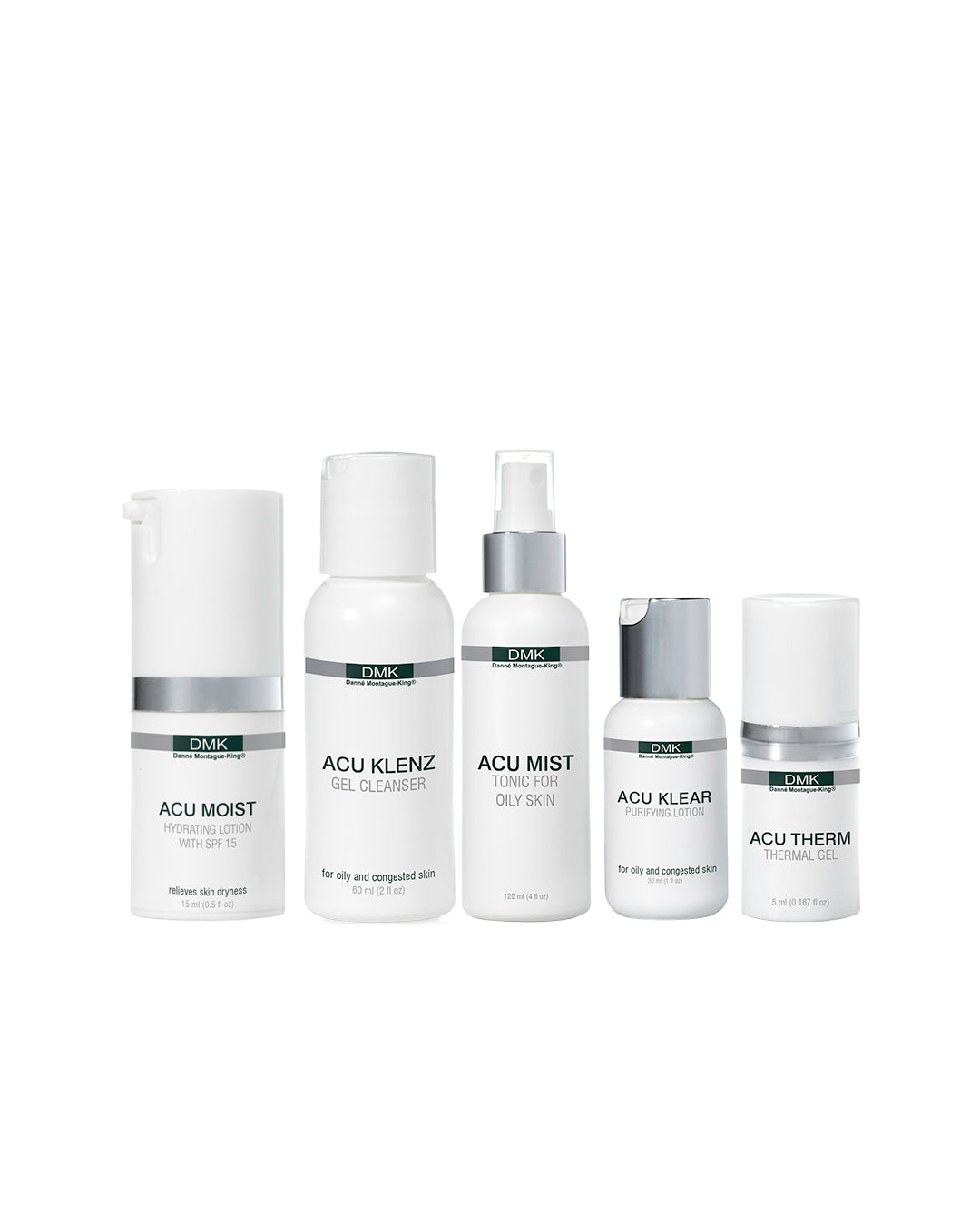 The DMK Candescent Clarity Acne Kit is the ideal way to address blemishes and clear the path for healthier skin. This 5-step regimen for acne-prone and oily skin includes Acu Klenz, Acu Mist, Acu Moist, Acu Klear, & Acu Therm.
