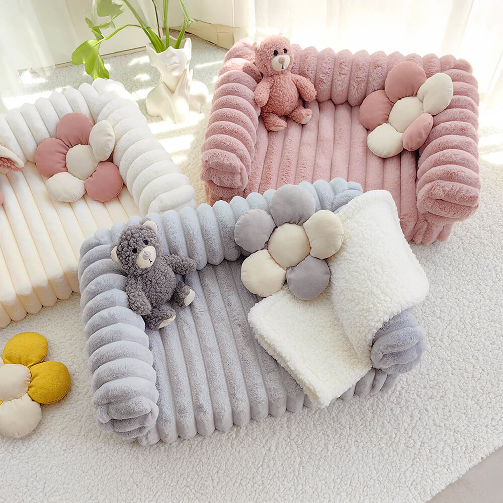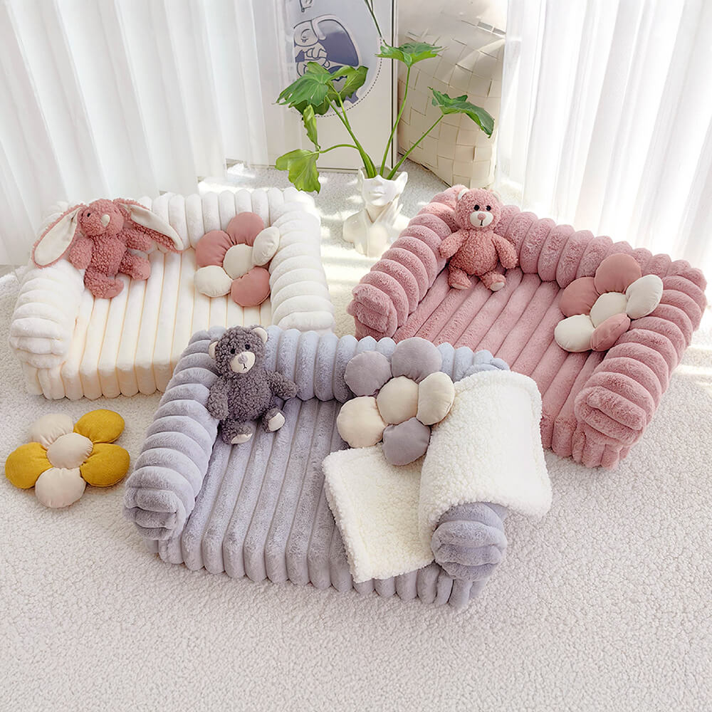 - Complete Comfort Set: Each bed comes with a matching blanket, a plush toy, and a flower-shaped pillow, creating a complete lounging experience for your pet. The blanket is perfect for extra warmth, the toy adds playful fun, and the pillow enhances support.