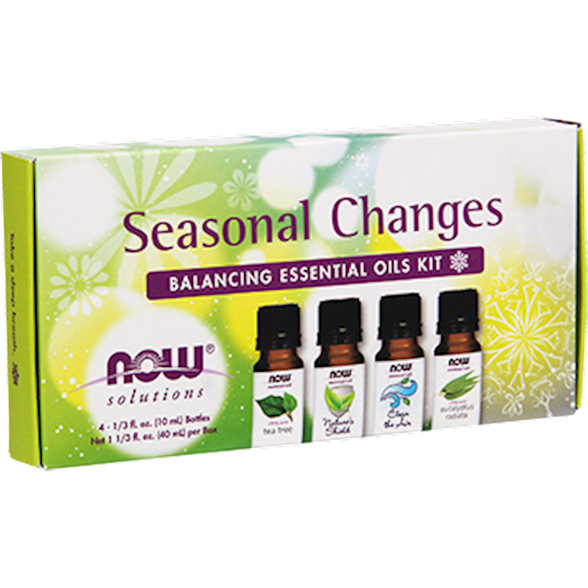For many of us the change of the season is an exciting time that heralds the arrival of special holidays or outdoor fun. But for some these changes arent quite so magical. If youre one who dreads the seasonal switch, take heart! NOW Solutions Seasonal Changes Essential Oils Kit was created just for you. Our unique collection of natural aromas, including Tea Tree and Eucalyptus Radiata oils, as well as our Clear the Air and Natures Shield oil blends, can help ease seasonal transitions so you can get back to doing what you love. Kit Includes: One 10 mL bottle of each of the following essential oils: Tea Tree, Nature's Shield, Clear the Air, and Eucalyptus Radiata Natural essential oils are highly concentrated and should be used with care. Potent & Effective Year-Round Well-Being