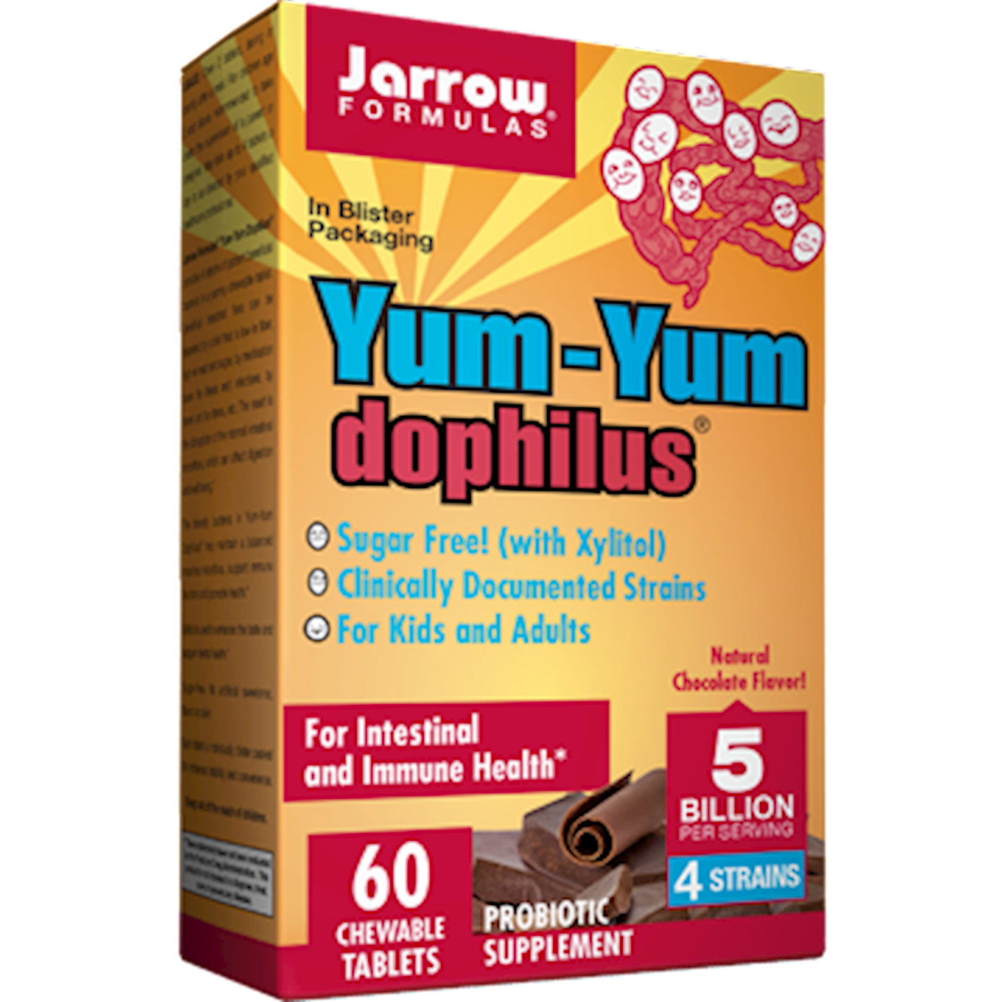 Jarrow Formulas Yum-Yum Dophilus provides 4 clinically documented strains of beneficial bacteria in a yummy chewable tablet. Beneficial intestinal flora can be negatively affected or reduced by a diet that is low in fiber, high in animal protein, the use of medication, travel and stress, etc. The friendly bacteria in Yum-Yum Dophilus help maintain a balanced intestinal microflora, support immune function and promote health.* Xylitol is used to enhance the taste and support dental health.* Sugar-Free. No artificial sweetener, flavor or color. Each tablet is individually blister packed for enhanced stability and convenience.